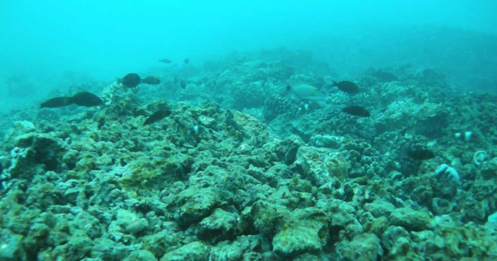 Photo of a diver inspecting the coral reef damaged by the USS Port Royal grounding. Photo by Hawa’ii DLNR.